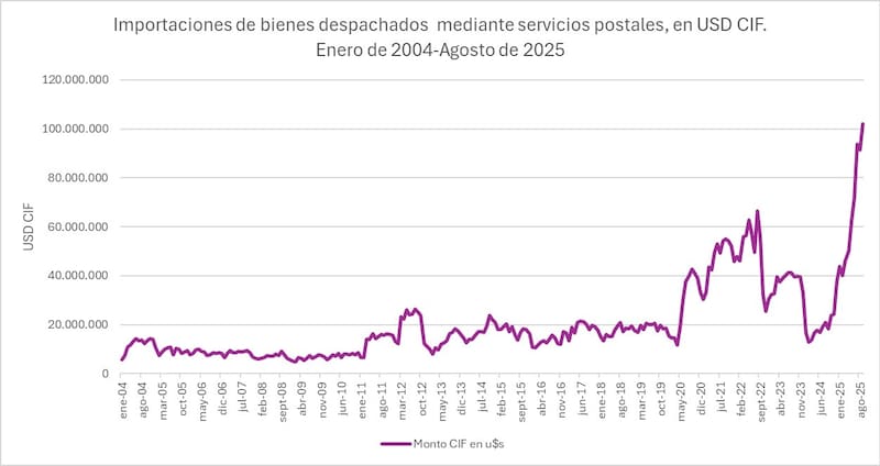 En septiembre, el grupo denominado “Bienes despachados mediante servicios postales” significó u$s 101,9 millones, mientras que todo “Resto” fue u$s 109 millones, en el mismo mes, lo que representa cerca del 95%.