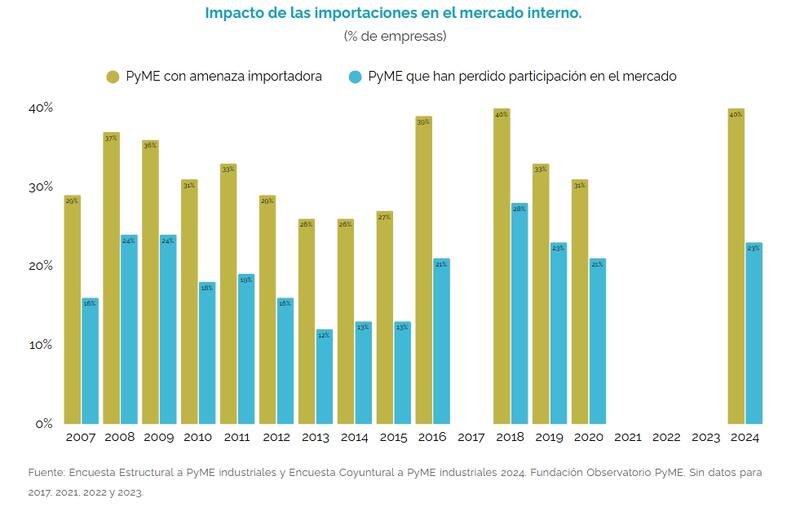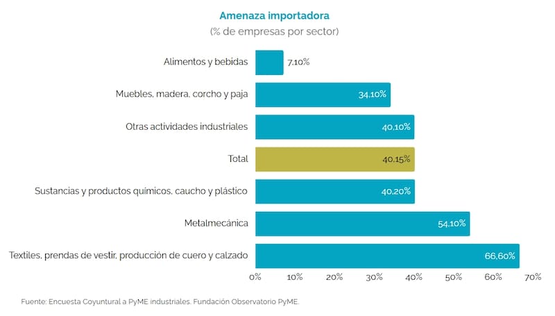 Además, indicaron que el 56% de las empresas pyme industriales que identifican a las importaciones como una amenaza observaron una caída de su participación en el mercado interno (23% del total).