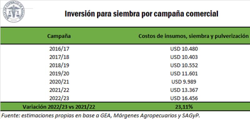 La estimación privada que estudió el costo de insumos, siembra y pulverización para soja de primera y de segunda, maíz temprano y tardío, trigo, girasol, sorgo, cebada cervecera y cebada forrajera, mostró una evolución en la inversión, 47% superior al promedio los últimos cinco ciclos agrícolas.