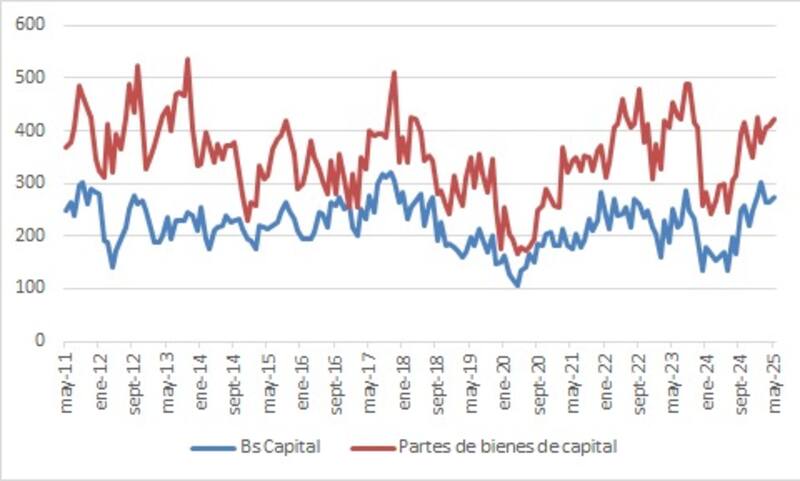 Entre 2003 y 2024, la participación de los bienes de capital se ubicó en torno a 19%, sin embargo, en el período 2021-2024 bajó al 16%. Por lo tanto, según CIRA, en 2025 la participación de bienes de capital "se está recuperando".