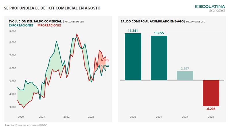 Por su parte el relevamiento de Abeceb explicó que el saldo negativo de agosto "augura la posibilidad de una continuidad de la profundización del déficit comercial acumulado en los 8 meses del año".