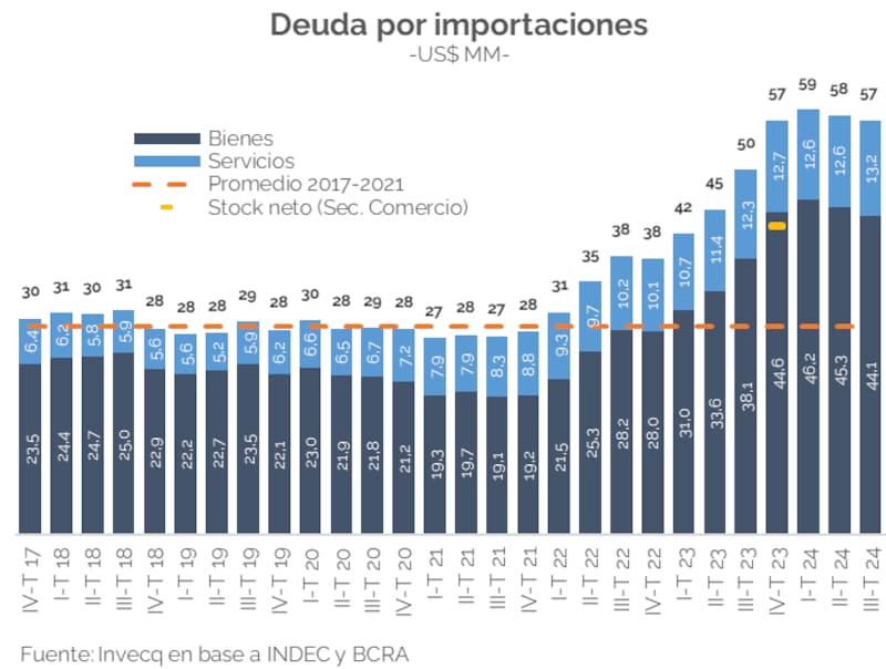 Pese a lo anterior, la deuda total por importaciones alcanzó los u$S 57.3000 millones a fines de septiembre 2024; es decir, el mismo valor que en diciembre 2023, destaca el informe privado.