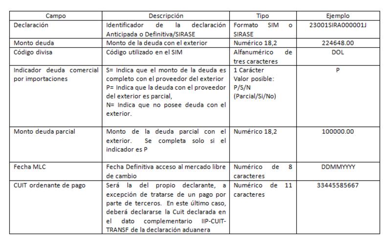 El archivo a remitir deberá contener la siguiente información, respetando el siguiente orden, Declaración; Monto deuda; Código divisa; Indicador deuda con el exterior (P/S/N); Monto deuda parcial; Fecha MLC; CUIT ordenante de pago. Hay una forma particular de enumerar los datos, que se detalla al final de esta nota.