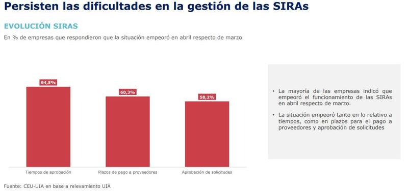 En ese sentido apunta que la mayoría de las empresas indicó que empeoró el funcionamiento de las SIRAs en abril respecto de marzo: 64,5% respondió que desmejoraron los tiempos de aprobación; 60,3% apuntó a los plazos de pago a proveedores y 58,2% se enfocó directamente en la aprobación de los pedidos.