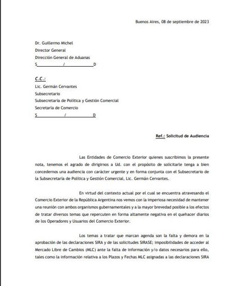 La nota que se emitió el 8 de septiembre y aun no fue respondida por las autoridades, solicita una reunión con el finde mediar soluciones frente a decisiones oficiales que "repercuten en forma altamente negativa en el quehacer diarios de los Operadores y Usuarios del Comercio Exterior".