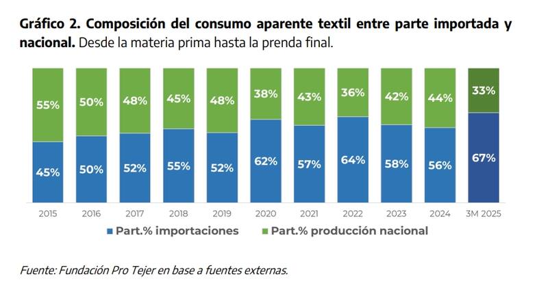 Ante la flexibilización normativa, según el último informe de Fundación ProTejer, la presencia de productos importados subió del 56% al 67% en el primer trimestre del 2025.