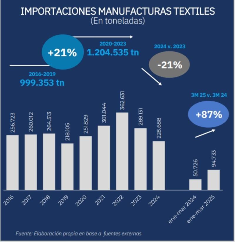 En el caso de tejidos de punto, durante el primer trimestre ingresaron más de 30.000 toneladas, un volumen que no se registraba desde hace más de una década.