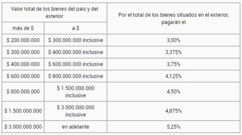 Puntualmente, el impuesto a la riqueza grava con una alícuota de entre 2% y el 5,25%, según la valuación de los bienes y su localización al 18 de diciembre, mientras que Bienes Personales, al 31 de diciembre, castiga con una tasa de entre 1,25% y 2,25% a los patrimonios de este nivel si están en el país o en el exterior, respectivamente.