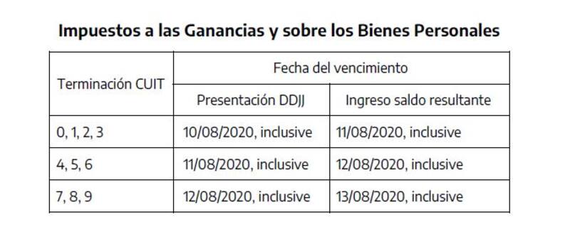 La medida, indicó el organismo, beneficia a 2 millones de contribuyentes. Con la prórroga, la segunda que se realiza por la cuarentena, la presentación de las declaraciones juradas y el ingreso del saldo resultante de Ganancias y Bienes Personales, originalmente previstos para mediados de junio, ahora se harán entre el 10 y 13 de agosto próximos, según la terminación de la Clave Única de Identificación Tributaria (CUIT) del contribuyente, se precisó.