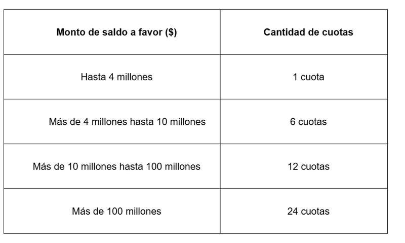 Hasta $ 4 millones será realizará la devolución en una cuota; más de $ 4 millones y hasta $ 10 millones en seis; más de $ 10 millones y hasta $ 100 millones en 12; y más de $ 100 millones en 24. Lo que va en línea de la meta de mantener el superávit fiscal.