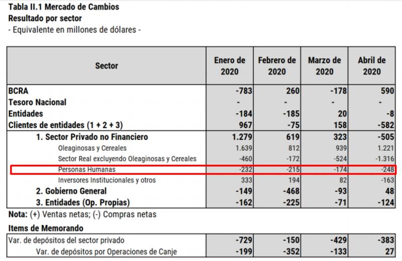 Si bien no todavía el Banco Central (BCRA) todavía no publicó el balance cambiario del mes pasado, las percepciones del impuesto correspondientes a la última semana de abril ingresaron al Fisco en mayo. A lo largo del cuarto mes del año, las personas humanas compraron u$s 248 millones, un 42% más que los u$s 174 millones adquiridos por este segmento en marzo.