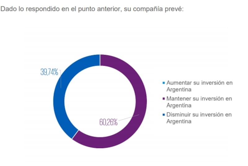 A partir de este panorama, el 60,26% estimó que mantendrá su inversión en Argentina, mientras que el 39,74% vaticinó que la disminuirá. En la encuesta no aparecen empresas que hablen de invertir más.