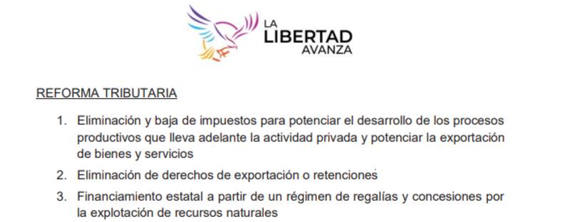 Uno de los ejes destacados dentro de la plataforma electoral de Javier Milei era la reforma tributaria a partir de la eliminación y baja de impuestos para potencial los procesos productivos en la actividad privada, además del establecimiento de un régimen de regalías y concesiones por la explotación de recursos nacionales.
