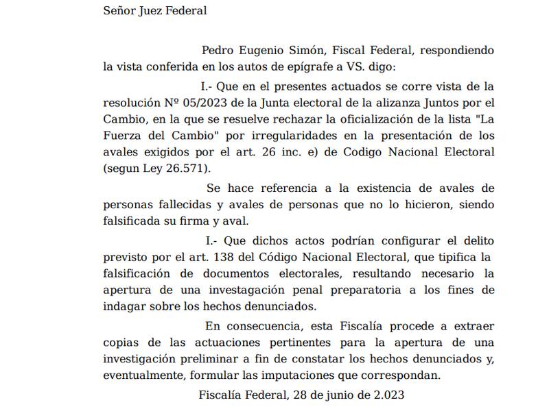 El documento presentado por el fiscal, fechado el 28 de junio, se refiere a la Resolución Nº 05/2023 de la Junta electoral de Juntos por el Cambio, que resolvió rechazar la oficialización de la lista "La Fuerza del Cambio" por "irregularidades en la presentación de los avales exigidos por el art. 26 inc. e) de Codigo Nacional Electoral (segun Ley 26.571)".