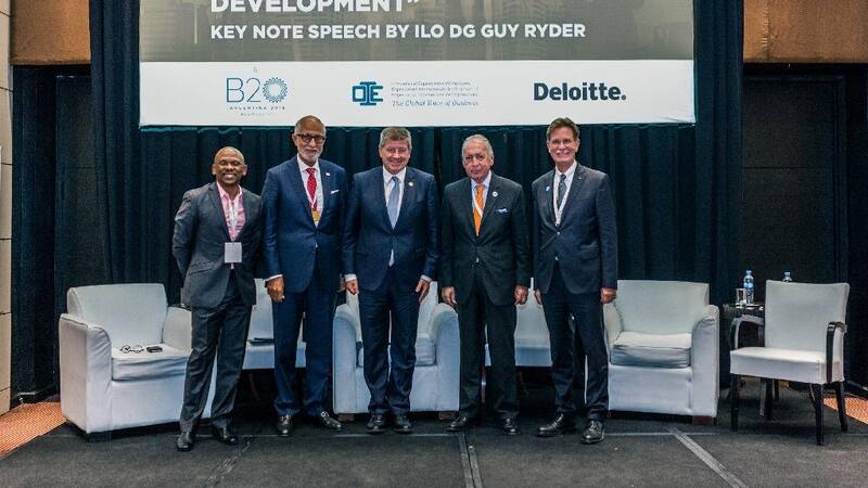 En el encuentro, se firmó una declaración entre el B20 y Labour 20 (L20), que establece recomendaciones al G20 para la generación de empleo futuro. Luego, miembros del B20 y del L20 abordaron el trabajo conjunto realizado para proponer recomendaciones de políticas públicas dirigidas a la creación de empleo. Matthias Thorns, director de la Participación de los grupos de interés de la OIE, moderó el panel integrado por Carolina Castro, sherpa Ejecutiva del B20; Kiresepi; Marta Pujadas, Sherpa del L20 y directora de Asuntos Jurídicos y Red Social Uocra, y Sharan Burrow, secretaria General de la Confederación Internacional de Sindicatos.