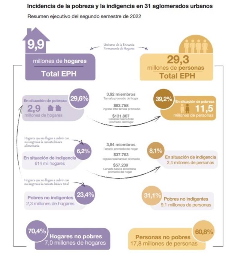 La pobrezaascendió hasta el 39,2% en el segundo semestre del 2022, informó el INDEC. Así, 11,5 millones de personas en el país no alcanzan a satisfacer sus necesidades básicas. Según el ente de estadísticas oficial, 2,4 millones son indigentes.