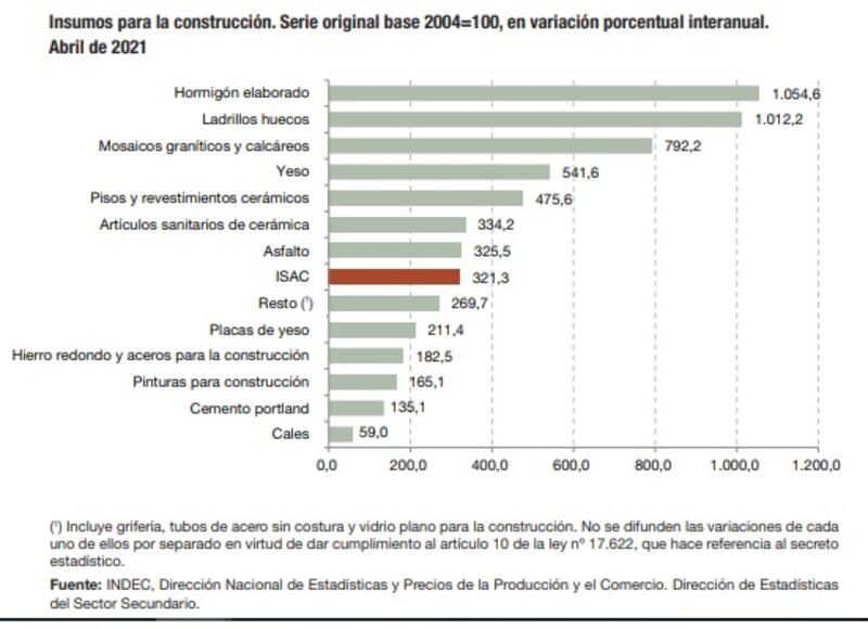 Esta misma tarde, el Indec dio a conocer el Indicador Sintético de la Actividad de la Construcción (ISAC) correspondiente al cuarto mes del año, que arrojó un incremento de 321,3% respecto de abril de 2020.