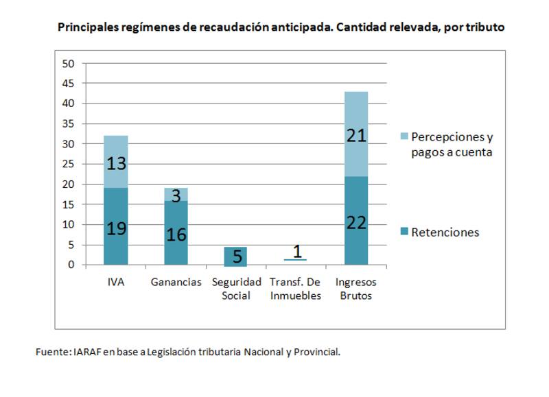 En el nivel nacional de gobierno, existen 57 regímenes de pago anticipado de impuestos. El IVA es el tributo que más normas de este tipo posee, con 32: 19 corresponden a regímenes de retención, 10 a esquemas de percepción y tres pagos a cuenta. El segundo gravamen que acumula más regímenes de pagos anticipados es el Impuesto a las Ganancias, con 19: 16 retenciones, dos percepciones y un pago a cuenta.
