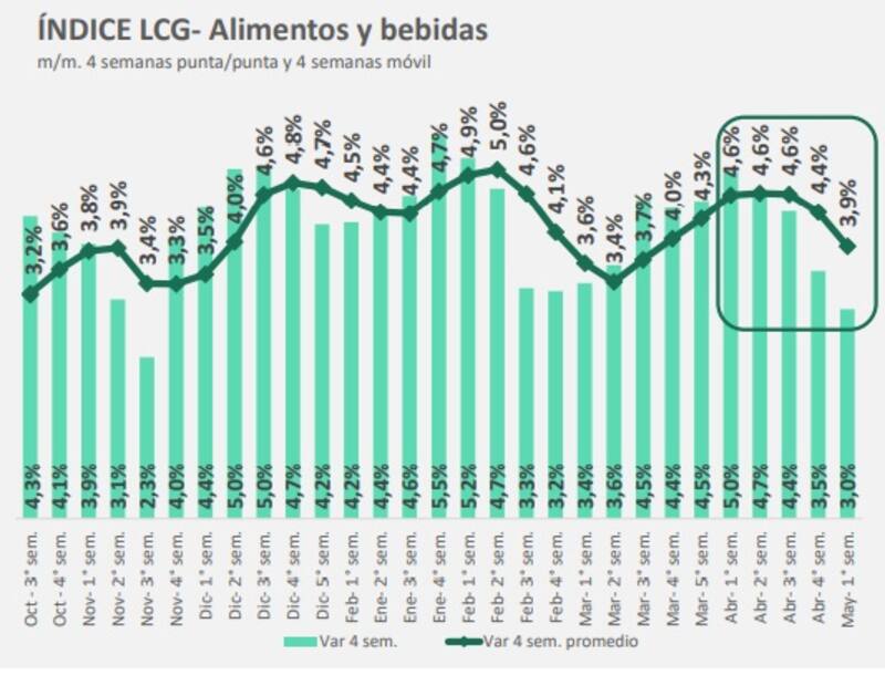 Según el relevamiento de la consultora LCG, el índice de alimentos y bebidas exhibió una inflación mensual promedio de 3,9%, una reducción respecto del 4,4% promedio calculado en la semana previa, aunque en la medición punta a punta de las últimas cuatro semanas el incremento es de 3%.