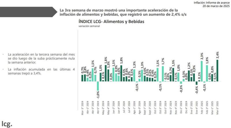 Los relevamientos de las consultoras privadas alertan que la tendencia continuará en marzo y se reflejará en la inflación. La consultora LGC informó que en la tercera semana del mes "Alimentos y bebidas" mostró una importante aceleración al registrar un aumento del 2,4%.