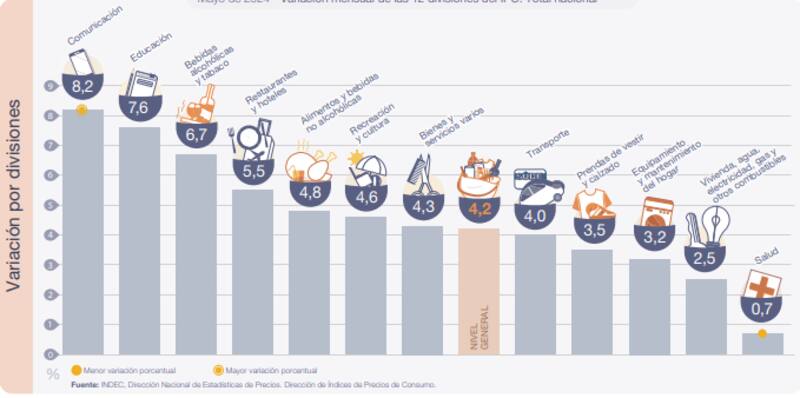 Los rubros que más subieron según el relevamiento fueron la comunicación (8,2), la cual creció casi el doble que el índice general, la educación (7,6) y las bebidas alcohólicas y tabaco. Por su parte, la salud creció tan solo un 0,7% luego de las idas y vueltas con las cuotas de las prepagas.