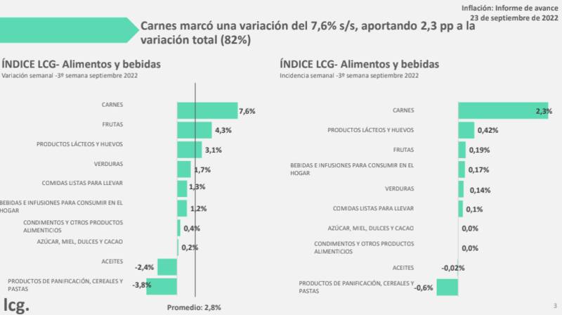 Uno de los datos claves es que las carnes marcaron una variación del 7,6% y explicaron casi la variación total de la semana. Estas encabezan la lista seguidas por frutas, productos lácteos y huevos, que subieron 3,1%.