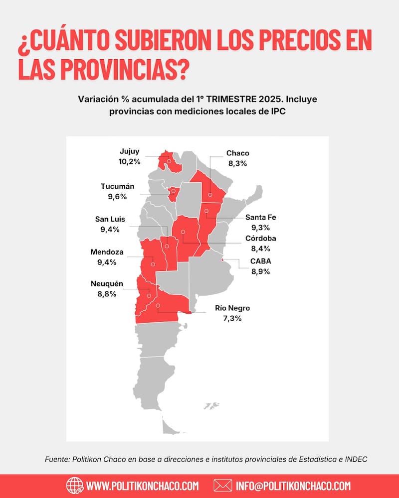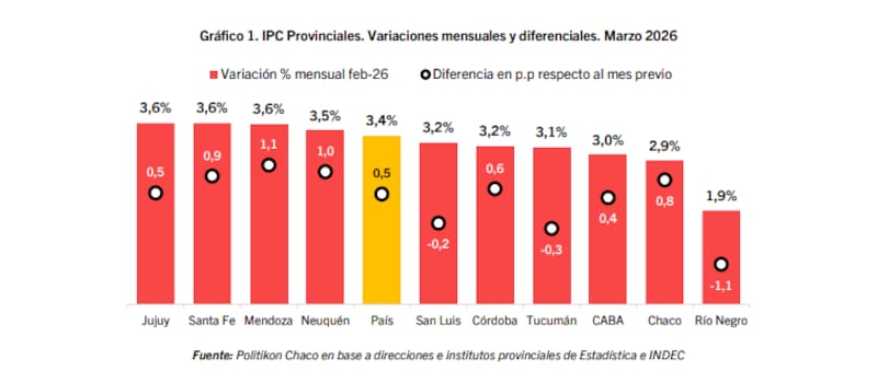 En términos interanuales, el panorama tampoco muestra alivio. La inflación nacional alcanzó el 32,6% en marzo, y cuatro provincias superaron ese nivel: Neuquén (35,9%), San Luis (33,5%), Mendoza (33,0%) y Santa Fe (32,7%). En contraste, Río Negro (23,2%) y Chaco (29,8%) fueron las únicas por debajo del 30%.