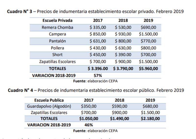 En cuanto a los kits de uniformes para colegios privados (considerando en todos los casos cuotas de colegios subsidiados o parroquiales), un equipo de remera o chomba, pantalón, campera, pollera, short, y zapatillas escolares, asciende a alrededor de $ 5960 mientras que en 2018 el costo era de $ 3790, es decir, un incremento de 57% entre 2018 y 2019.