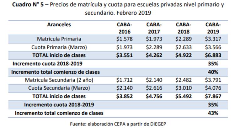 Según lo revelado por un informe del Centro de Economía Política Argentina (CEPA), la canasta escolar, integrada por 12 útiles para un alumno en educación primaria, tuvo un costo de $ 1007,60 en febrero y evidenció un aumento de 54% respecto al mismo período de 2018. En tres años, la suba ya acumula un 229%.