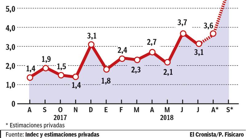 No obstante, lo peor lo espera para septiembre. "Estamos asustados sobre lo que puede dar. Por el aumento del dólar a fin de agosto ya se ven fuertes subas en alimentos como aceites, harinas; también en la nafta y las listas de precios de los autos", identificó. Por ahora la estiman en 6%. "Habrá que ver si se da, pero la prevemos en ese número ya que el salto cambiario fue muy fuerte y agudo, en un contexto en el que la anterior devaluación no la habían terminado de incorporar", agregó. "En julio discutíamos si pasaba el 32%; en agosto, el 35%; y ahora ya superó el 40% para el año", reconoció.