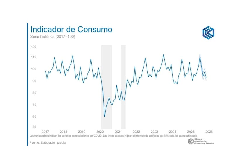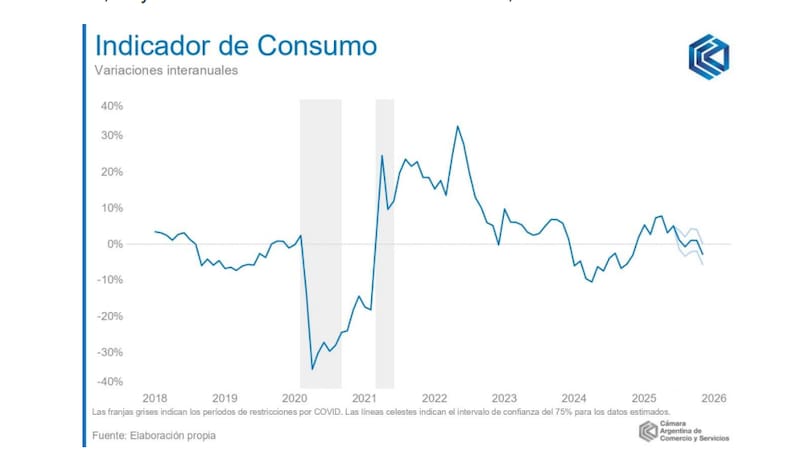 Según el último informe que difundió la Cámara Argentina de Comercio y Servicios (CAC), el Indicador de Consumo (IC) registró en noviembre de 2025 una contracción interanual del 2,8%, mientras que la medición desestacionalizada mostró un retroceso mensual del 1,3% respecto de octubre. Se trata de un resultado que interrumpe una secuencia mayormente positiva a lo largo del año y que vuelve a poner el foco sobre la fragilidad del consumo de los hogares.