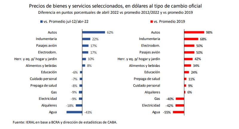 En el trabajo del Ieral, os economistas Jorge Vasconcelos y Mariano Devita analizaron las diferencias sectoriales. En la comparación del precio en dólares de abril de 2022 contra el promedio de julio 2012/abril 2022, el precio de los autos se encareció un 62% en dólares respecto del promedio de la última década, junto con la indumentaria, pasajes de avión y electrónica. El "suministro de agua" se abarató un 43% y de ese lado también figuran el gas, electricidad y los alquileres.