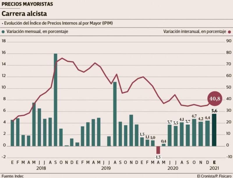 A las mediciones que hacen las consultoras se le suma el significativo salto de 5,6% que los precios mayoristas marcaron en enero, que desde junio no bajó del 3,5% mensual y cuatro oportunidades superó el 4%, según datos del Indec.