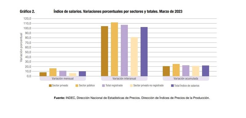 En marzo de 2023, el Índice de salarios que mide el INDEC se incrementó 10,1% mensual, por encima de la inflacion de ese mes, quefue del 7,7%.