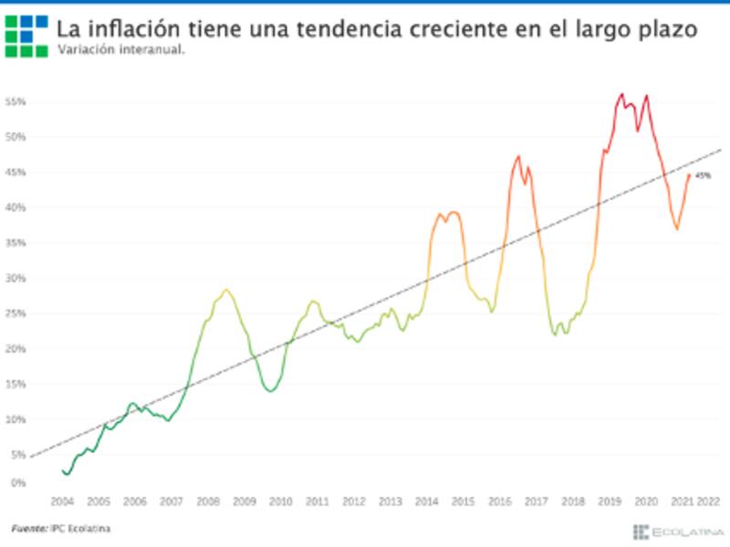 "La inflación anual en nuestro país es de dos dígitos desde hace más de diez años y, más allá de los vaivenes causados por los incentivos electorales, ha exhibido una tendencia creciente. Así, en la primera mitad de la década pasada la inflación anual promedió casi 28%, teniendo su pico de casi 38% en 2014, un registro muy cercano a la media de la segunda mitad de la década, cuando solo en 2017 se observó una inflación inferior al 30%", explicaron desde la consultora Ecolatina.