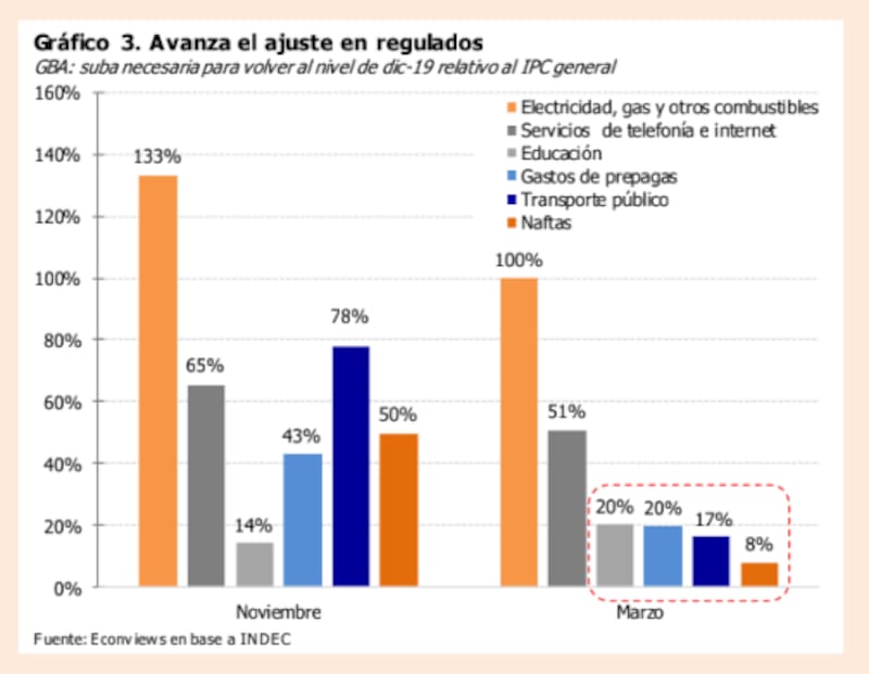 Hacia adelante, Econviews asegura que prepagas, transporte público y naftas "ya corrigieron la mayor parte del atraso acumulado en los últimos 4 años", y que "con subas de 8- 20% vuelven al nivel de diciembre de 2019 en términos reales".