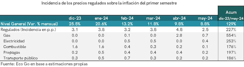 Así, mientras la inflación entre diciembre del 2023 y mayo del 2024 acumulará un 129%, regulados estará en 227%, estima Eco Go.