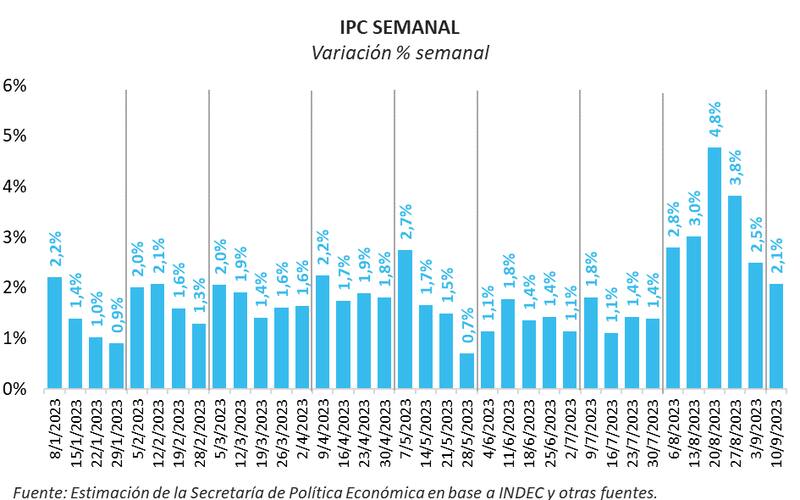 "Si bien el valor semanal sigue siendo muy alto, se encuentra ya bastante más en línea con valores previos a la devaluación de agosto. Estimamos que los registros semanales de inflación acentúen y consoliden su tendencia a la baja en las próximas mediciones", se expresó en la cuenta de la Secretaría de Política Económica en la red social X -ex Twitter-.