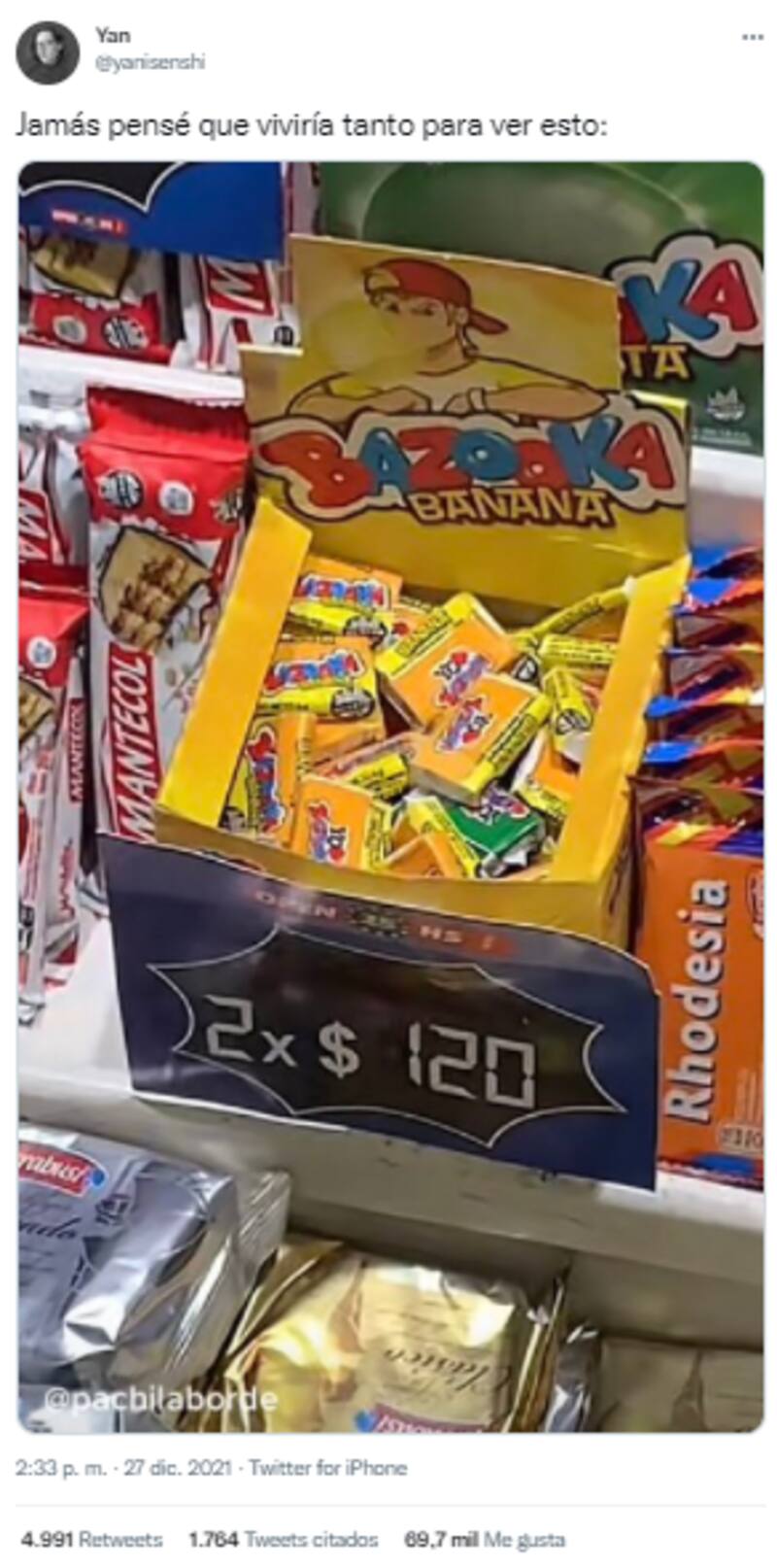 "Jamás pensé que viviría tanto para ver esto", advierte la publicación de una usuaria de Twitter al compartir la promoción que ofrece un kiosko por la compra de dos chicles.