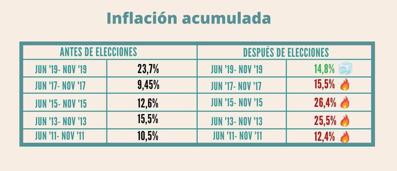 - En 2019 fue del 23,7 % y en los 6 meses posteriores de solo 14,8 %. "Solo el cierre de la economía y la cuarentena estricta en pandemia logró que la inflación acumulada en los 6 meses posteriores a las elecciones generales de 2019 por primera vez sea inferior a los 6 meses anteriores", explicaron desde Focus Market.