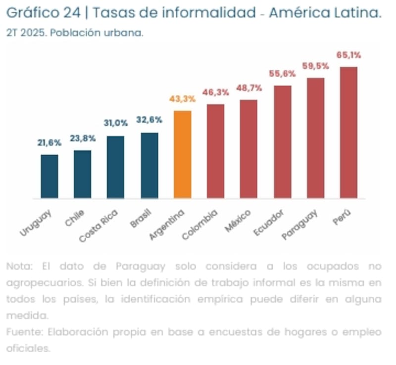Argentina, con una tasa superior al 40%, queda así lejos de los países con mercados laborales más formalizados, pero también por debajo de los casos más críticos de la región.