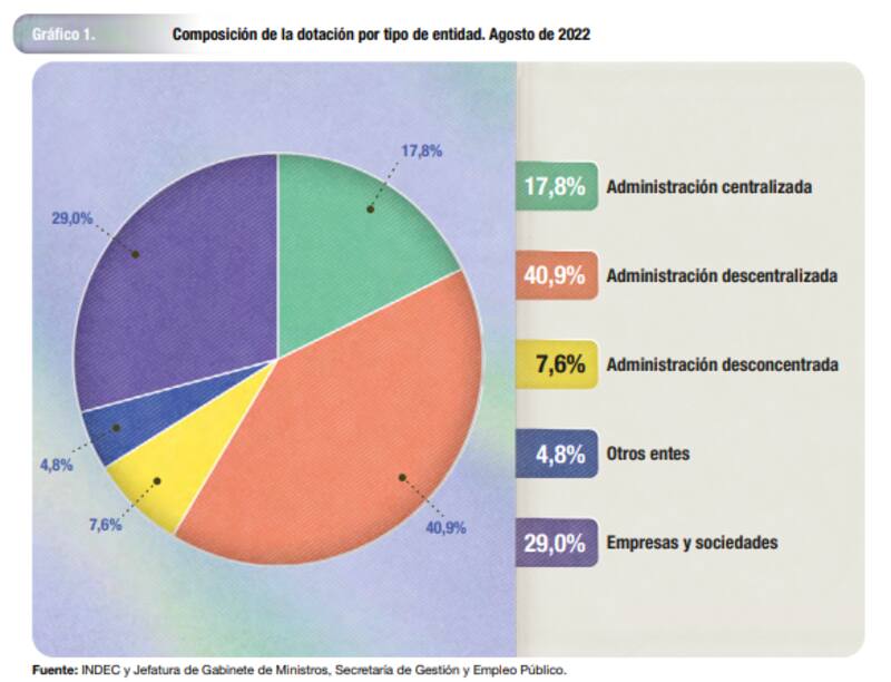 De acuerdo a lo informado por los distintos componentes del Estado, la Administración centralizada representa el 17,8% del total, la Administración descentralizada el 40,9%, la Administración desconcentrada el 7,6%, otros entes 4,8% y las Empresas y sociedades el 28% restante.