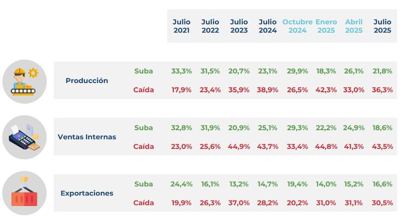 El dato que aportó la última encuesta de la Unión Industrial Argentina (UIA) sobre Indicadores Industriales y Expectativas donde predominaron los resultados negativos: El 36,3% de las empresas redujo su producción respecto al promedio del segundo trimestre del año, frente a un 21,8% registró incrementos mientras que el 43,5% reportó bajas en ventas y solo el 18,6% subas.