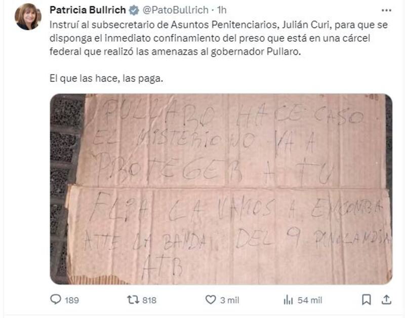 La ministra de Seguridad de la Nación, Patricia Bullrich, informó este martes que dispuso el "inmediato confinamiento" del preso acusado de amenazar desde un cárcel federal al gobernador de Santa Fe Maximiliano Pullaro.
