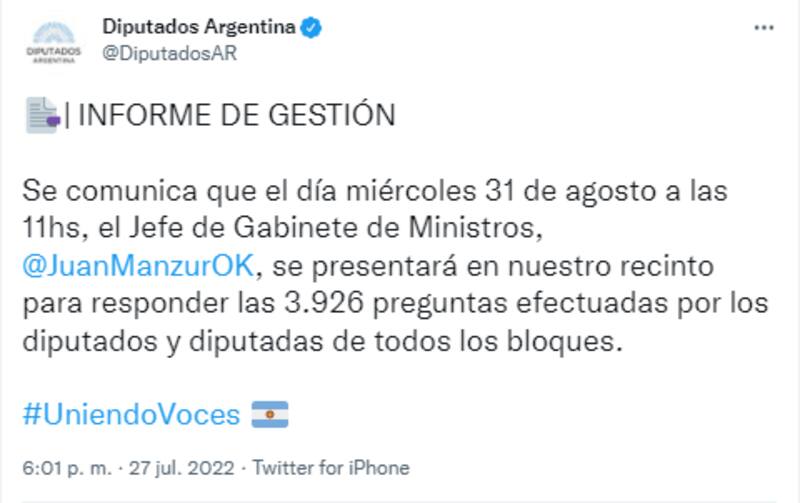 De todas maneras, mientras el ex intendente de Lomas de Zamora mostraba su apoyo, esta tarde se conoció que Manzur estará en el recinto de Diputados el próximo 31 de agosto para responder 3926 preguntas de los legisladores.
