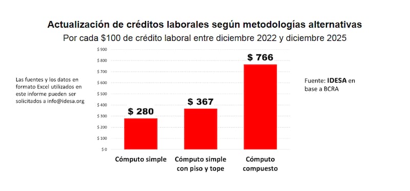 Según estimaciones técnicas, un crédito laboral de $100 originado en diciembre de 2022 alcanzaría cerca de $280 con cómputo simple, $367 aplicando el esquema de la ley con piso y tope, pero $766 si se utiliza el cálculo compuesto.