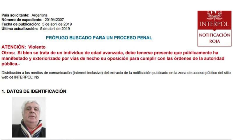Una circular roja solicitada por Argentina fue emitida hoy por Interpol para la detención de José Alberto Samid, a quien se considera una persona "violenta" que se opone a cumplir las órdenes de la autoridad pública.
