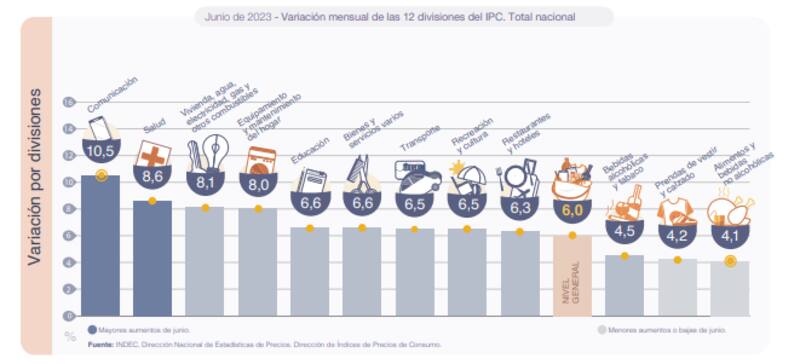 Durante junio los aumentos los lideró el rubro "Comunicación", el cual se incrementó un 10,5% y se encontró por arriba de la media. Lo siguieron "Salud" y "Vivienda", los cuales registraron aumentos del 8,6 y el 8,1% durante el último mes.