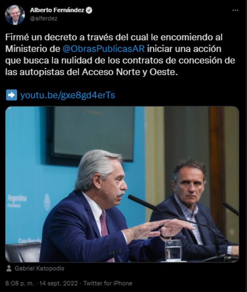 "Hemos venido aquí con el ministro Katopodis para anunciarles que he firmado un decreto a través del cual le encomiendo al Ministerio de Obras Públicas iniciar una acción que busca la nulidad de los contratos de concesión de las autopistas del Acceso Norte y Oeste", explicó Alberto Fernández al inicio de su discurso.