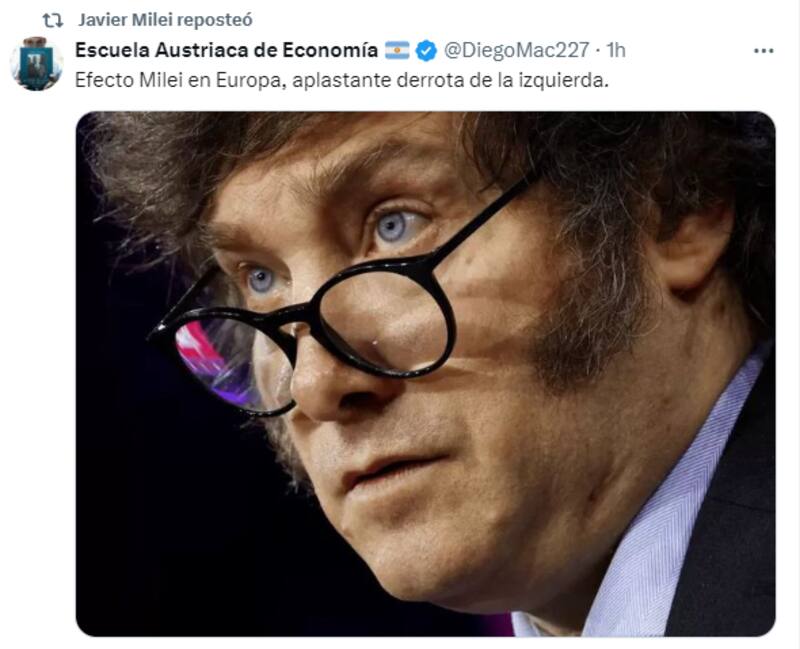 El jefe de Estado argentino expresó su postura a través de un retuit de un mensaje publicado por la cuenta Escuela Austríaca de Economía: "Efecto Milei en Europa, aplastante derrota de la izquierda".